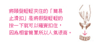 有止滑扣確實的固定住頭髮。止滑扣的種類也相當豐富,可以試用種種止滑扣來做組合使用。