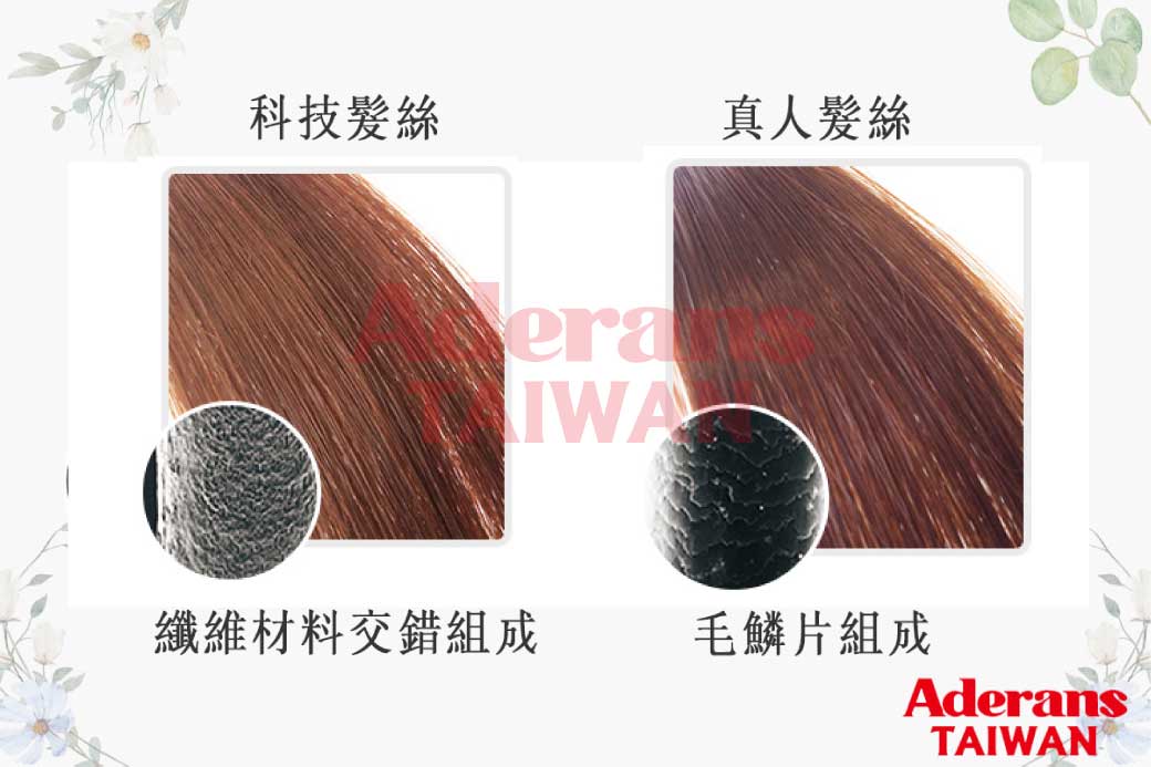科技髮絲好整理、塑型、價格較親民;真人髮自然逼真,但較不易塑型且價格偏高;混和髮絲結合以上兩者特質容易塑型整理、且自然舒適,價格依材質比例、覆蓋範圍大小,而有所不同。